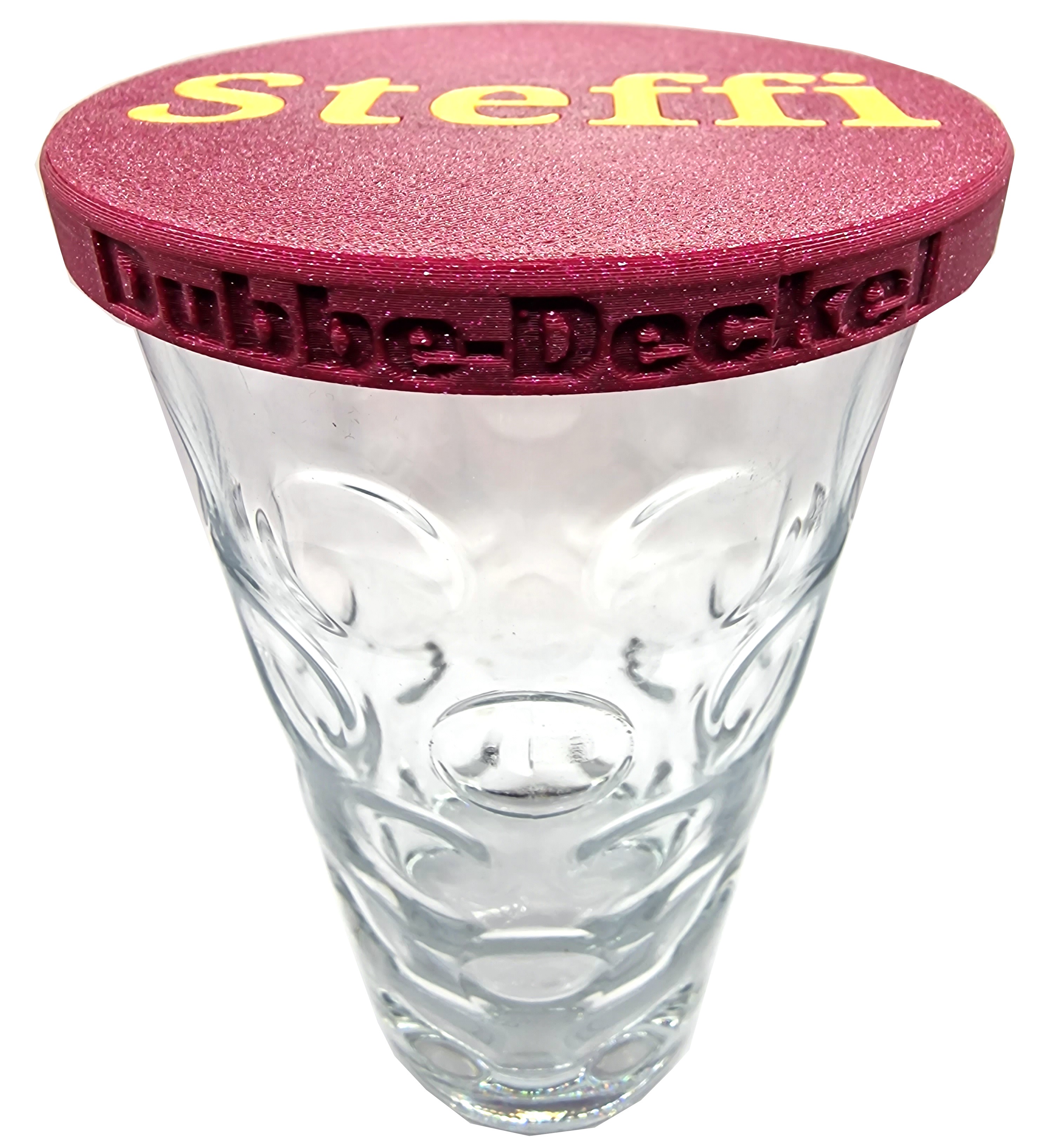 Die Deckel werden mit einem speziellen Glitzer-Filament gedruckt, die eingedruckte Schrift ist goldfarben.