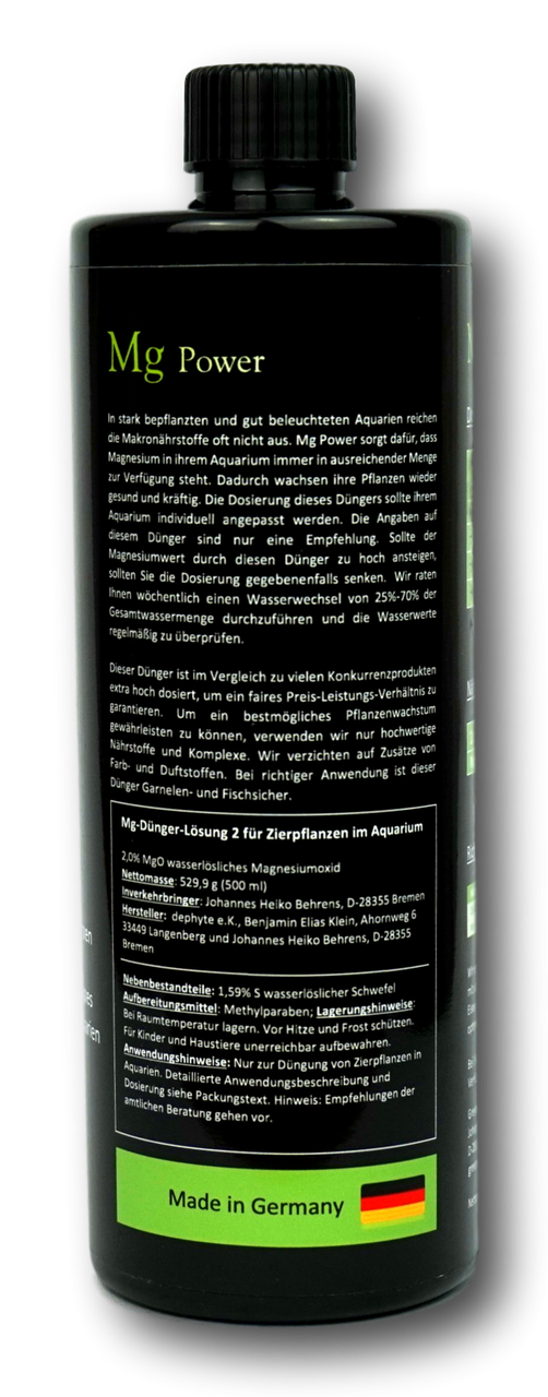 In stark bepflanzten und gut beleuchteten Aquarien reichen die Makronährstoffe oft nicht aus. Mg Power sorgt dafür, dass Magnesium in ihrem Aquarium immer in ausreichender Menge zur Verfügung steht. Dadurch wachsen ihre Pflanzen wieder gesund und kräftig. Die Dosierung dieses Düngers sollte ihrem Aquarium individuell angepasst werden. Die Angaben auf diesem Dünger sind nur eine Empfehlung. Sollte der Magnesiumwert durch diesen Dünger zu hoch ansteigen, sollten Sie die Dosierung gegebenenfalls senken. Wir empfehlen Ihnen wöchentlich einen Wasserwechsel von 25%-70% der Gesamtwassermenge durchzuführen und die Wasserwerte regelmäßig zu überprüfen.