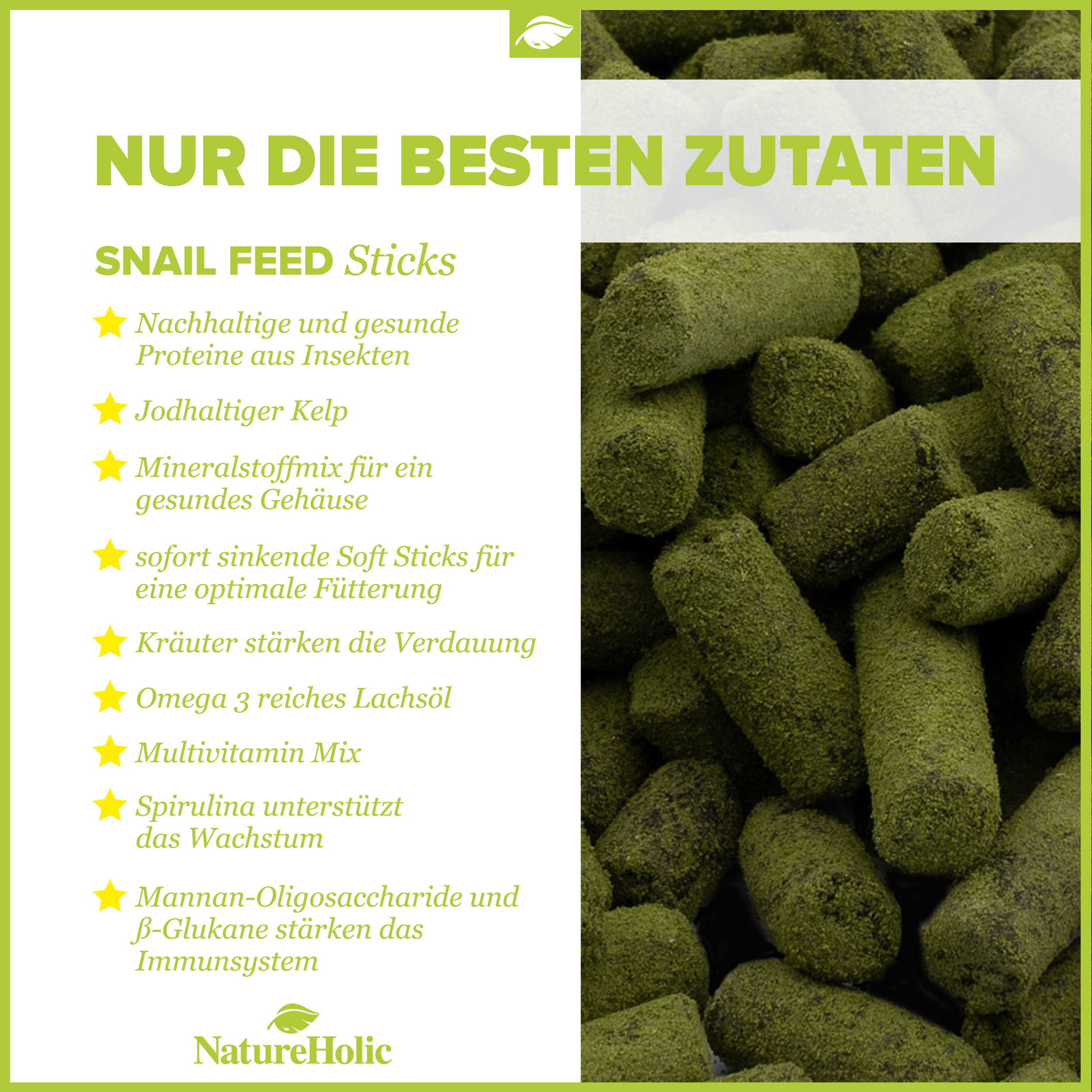 Die Natureholic Schneckenfeed Sticks sind genau auf die Bedürfnisse von Süßwasserschnecken in der Aquaristik abgestimmt, die Aufwuchs, Algen und Detritus fressen. Sie bekommen über die NatureHolic Snailfeed Softsticks alle notwendigen Nährstoffe und die Mineralstoffe, die sie brauchen, um ein schönes Gehäuse aufzubauen und nachhaltig wachsen zu können.